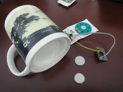 音乐杯是一种特殊的陶瓷杯,是在杯体完成后经特殊加工而成。杯子表面设计成自己需要的广告图案或文字,在杯子的底盘加上了音乐IC,音乐IC中录好了所需要音乐。当你拿起杯子,录好的音乐就会响起。原原理是杯子底部装上带有音乐芯片和光敏开关集成电路,再用树脂材料将其密封。拿起杯子,开关自动打开,奏响音乐;奏完一曲后,自动停止;放下杯子,开关断开,音乐停止。